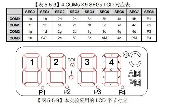 例如上图,若在COM3和SEG5之间加上电压,则会点亮AM这两个字母的显示。