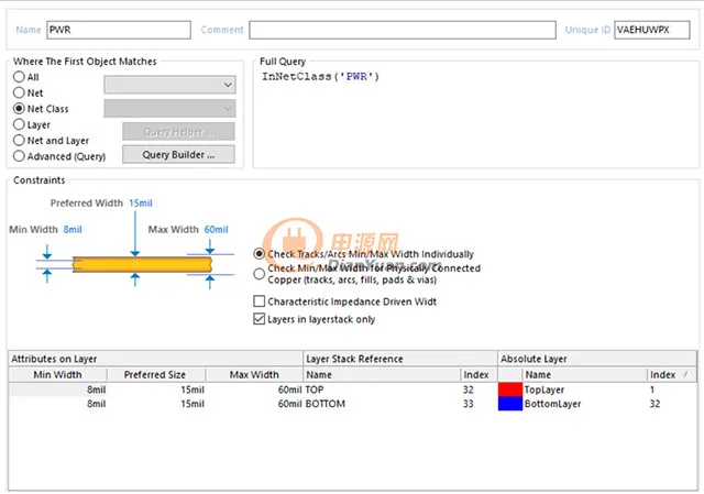 <strong>【布线规则5】</strong>PWR(针对电源网络的线宽规则):最小宽度6mil、常规宽度15mil、最大60mil,具体如下: