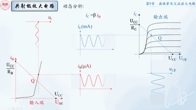<li>红色为输入端,u<sub>i</sub>的变化会影响U<sub>BE</sub>,把发射结看成一个小电阻,红色的Q点就会沿黑线运动,然后画出i<sub>B</sub>的图像</li>