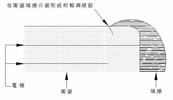 在机械力作用下板材弯曲变形时,陶瓷的活动范围受端位及焊点限制,破裂就会在陶瓷的端接界面处形成,这种破裂会从形成的位置开始,从45°角向端接蔓延开来。