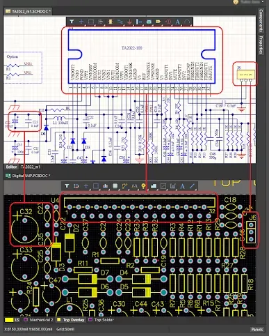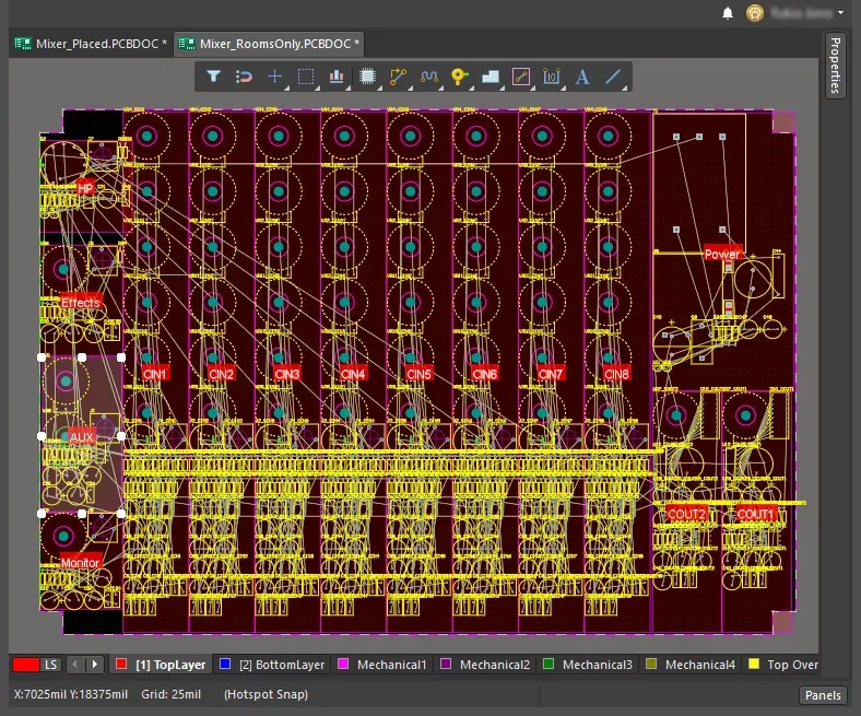 以下是具有多通道设计的音频混音器的示例。放置在混音器板上的零件的位置几乎取决于产品规格。因此,通过使用模块将零件分配到指定区域,可以大大提高工作效率。