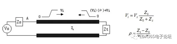 下图描绘了加在长的传输线上的初始波形,初始的电压Vi传送到传输线上直到到达末端,Vi的幅度通过驱动器电阻和传输线阻抗的分压来决定: