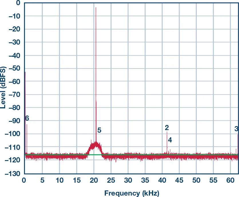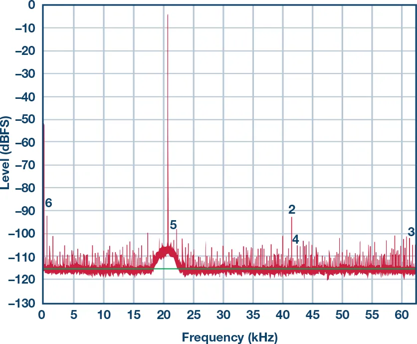 图6显示了从模拟电源去除去耦电容后的频谱。请注意,高频杂散信号增加了,还出现了一些交调产物(低频成分)。信号SNR已显著降低。本图与上图的唯一差异是去除了去耦电容。