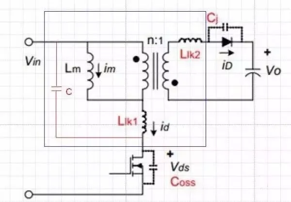MOS关断时,漏感能量流出给Coss充到高点,即Vds反射尖峰的顶点上。到最高点后Lk相位翻转,Coss反向放电,这时电流流出,也就是Id负电流部份的产生。