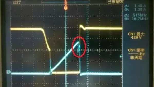 <strong>问题一,一反激电源实测Ids电流时前端有一个尖峰(如下图红色圆圈里的尖峰图),这个尖峰到底是什么原因引起的?怎么来消除或者改善?</strong>