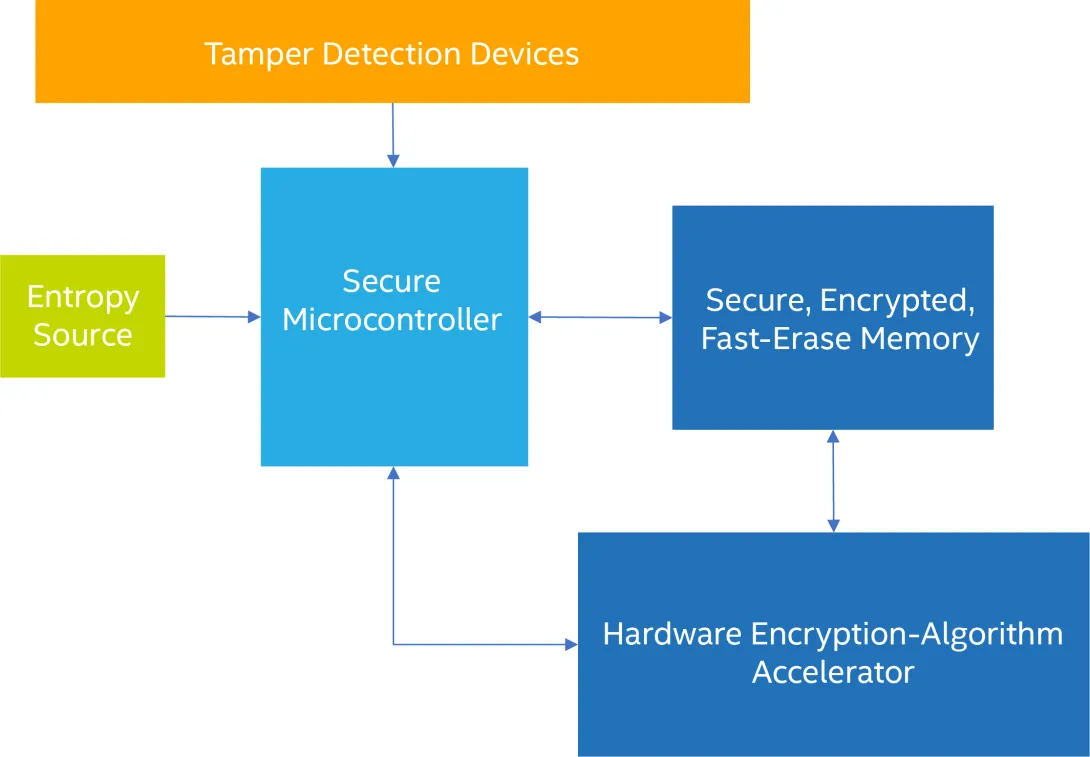 防篡改功能需要硬件支持,包括运动、电容、辐射、电压和温度传感器。将有一个安全的微控制器,在理想情况下,内存和 I/O 接口上配备了内嵌加密/解密。该 MCU 负责监控传感器以及监督 HSM 的其他功能。它还负责读取某种模拟设备,以获取随机数生成的种子。当然,MCU 应该能够免受侧信道攻击。