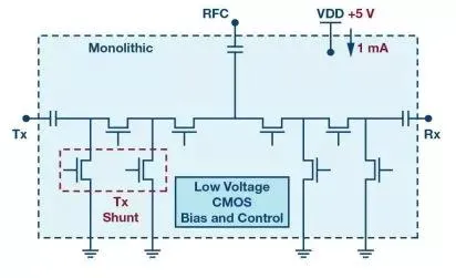 ADI 的新款高功率硅开关更适合大规模 MIMO 设计。它们依靠单 5 V 电源供电运行,偏置电流小于 1 mA,并且不需要外部组件或接口电路。图 4 中示出了内部电路架构。基于 FET 的电路可采用低偏置电流和低电源电压工作,因而将功耗拉低至可忽略的水平,并可在系统级上帮助热管理。除了易用性之外,该器件架构还可提供更好的隔离性能,因为在 RF 信号路径上纳入了更多的并联支路。