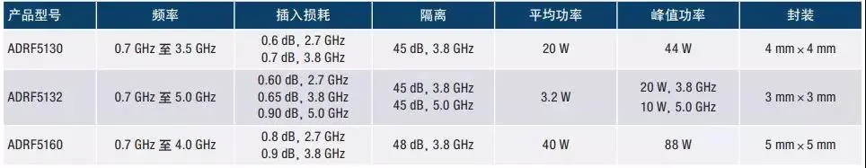 ADI 的高功率硅开关能够处理高达 80 W 的 RF 峰值功率,这足以满足大规模 MIMO 系统的峰值平均功率比要求,并留有裕量。表 1 列出了 ADI 专为不同的功率级别和各种封装类型而优化的高功率硅开关系列。这些器件继承了硅技术的固有优势,而且与替代方案相比,可实现更好的 ESD 坚固性和降低部件与部件间的差异。