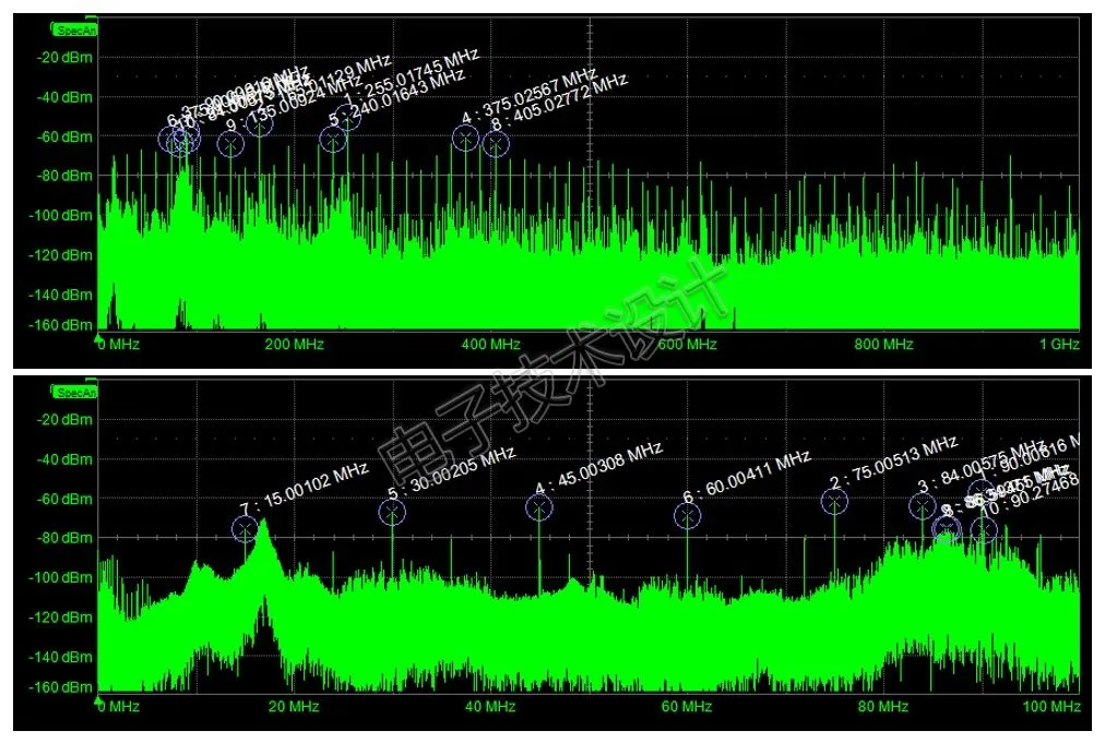 图2中下部波形显示了噪声频谱的前100MHz的放大图,它显示出明显的噪声峰值,奇怪的是,它几乎从15MHz开始,接着是30MHz,45MHz,依此类推,这无疑是来自外部的RF噪声。