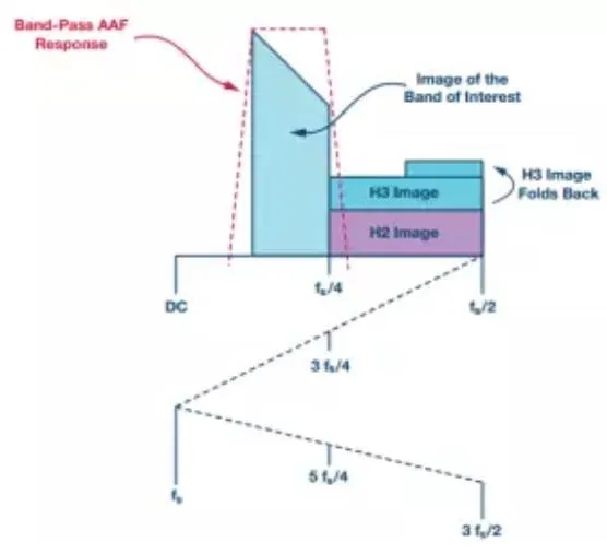 ADC采样的频率都会落在ADC的第一奈奎斯特(DC—125MHz)频段。这种现象称为混叠,因此这些频率包括目标频段、折回或混叠到第一奈奎斯特频段的二次和三次谐波,如图5所示,说明如下: