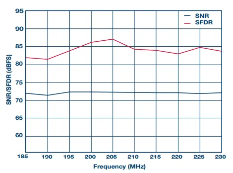 <center><img src="http://mouser.eetrend.com/files/2019-09/wen_zhang_/100045084-79937-15.p…; alt=“图15:图12所示14位1 GSPS ADC设计的SNR/SFDR与频率的关系” width="600"></center><center><i>图15. 图12所示14位1 GSPS ADC设计的SNR/SFDR与频率的关系</i></center>