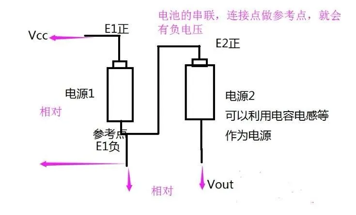 想产生负电压,就让它相对于电源负极的电势更低即可。要想更低,必须有另一个电源的介入,根本原理都是利用两个电源的串联。电源2正极串联在参考电源1的负极后,电源2负极就是负电压了。